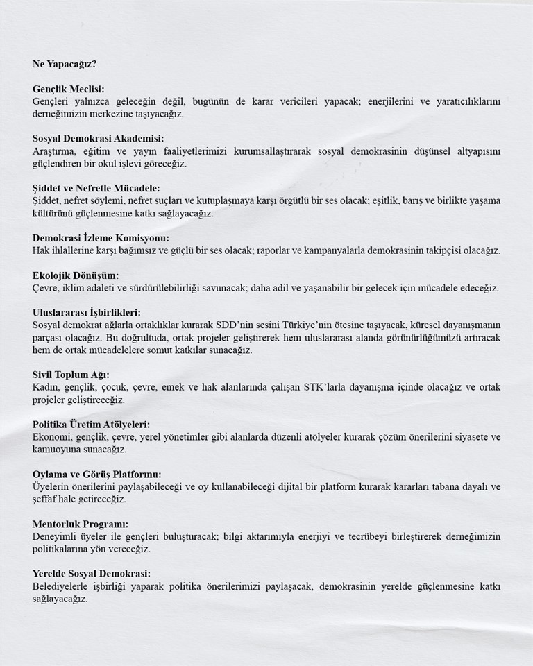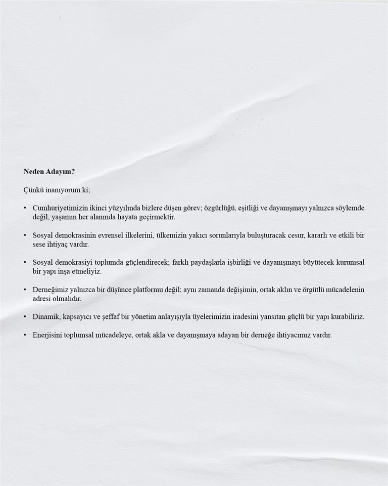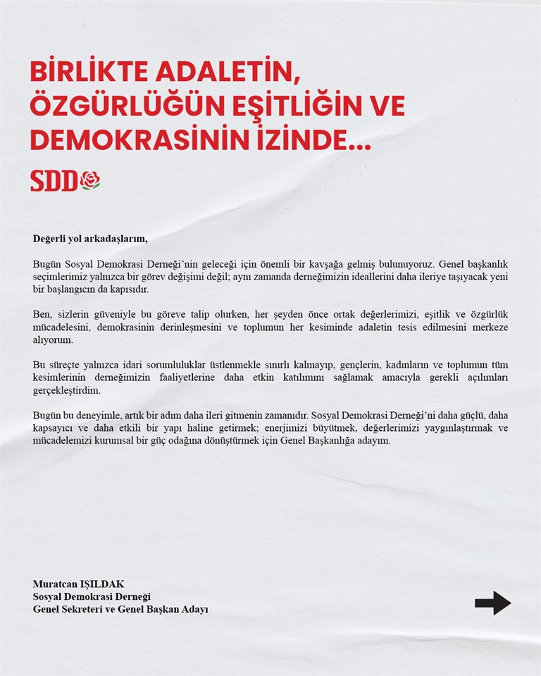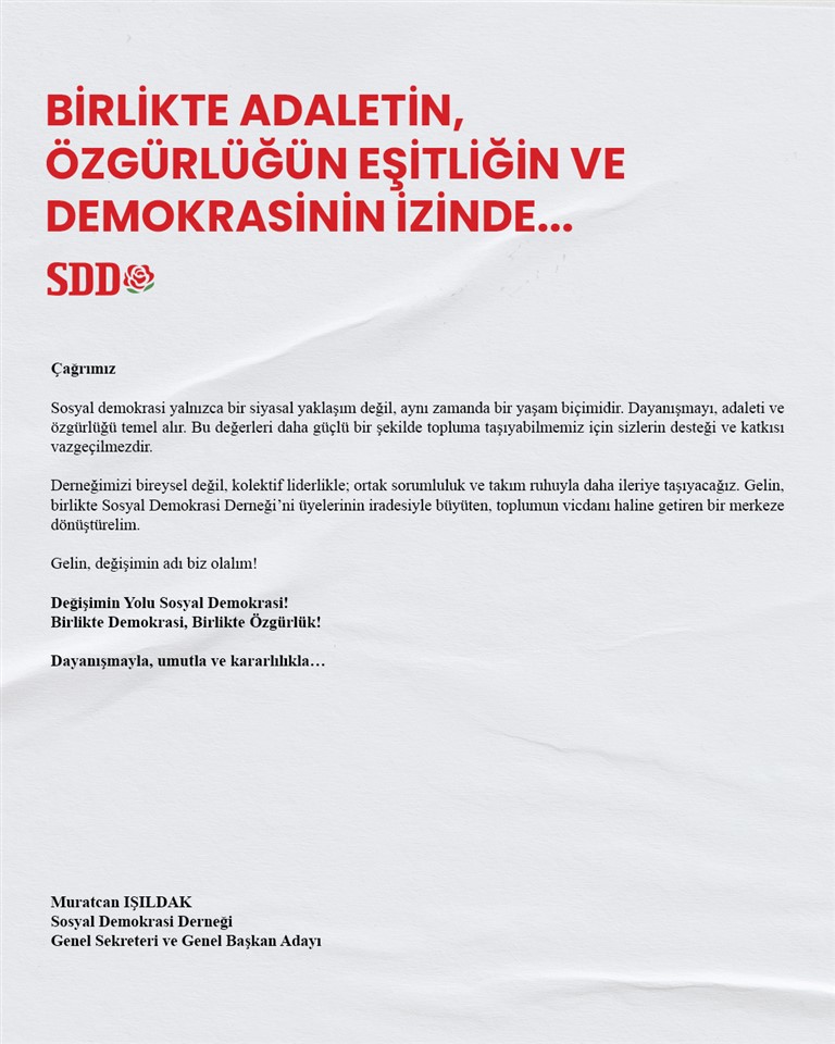 Cumhuriyetimizin ikinci yüzyılında, sosyal demokrasinin değerlerini güçlendirmek, daha katılımcı ve kapsayıcı bir örgütlenme anlayışını hayata geçirmek amacıyla Sosyal Demokrasi Derneği Genel Başkanlığına aday olduğunu açıklayan Muratcan Işıldak, vizyonunu ve hedeflerini içeren “Birlikte Adaletin, Özgürlüğün, Eşitliğin ve Demokrasinin İzinde” başlıklı manifestosunu kamuoyu ile paylaştı.