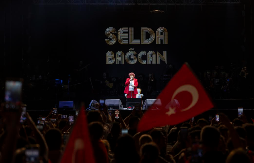 Başkan Seçer ve Meral Seçer ellerinde Türk bayrakları ile sahneye çıktı ve Mersinlilerle birlikte hep bir ağızdan ‘Parla’ marşını söylediler. Cumhuriyet Bayramı coşkusu, Türk müziğinin efsane sesi Selda Bağcan konseriyle Mersin’de doruğa ulaşırken; yıllara damga vuran eserlerini bu kez Mersinliler için seslendiren sanatçı, alanı dolduran yurttaşlara unutulmaz bir festival ve bayram yaşattı.