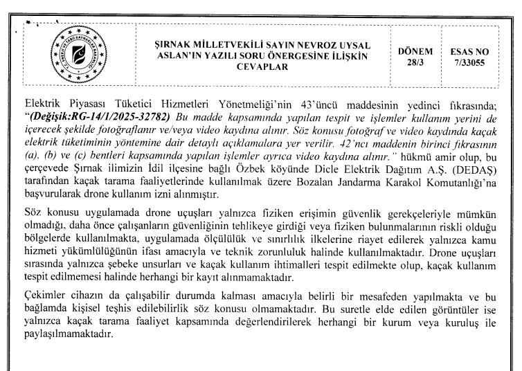 DEM Parti Şırnak Milletvekili Nevroz Uysal Aslan, Şırnak’ın İdil ilçesine bağlı Özbek köyünde DEDAŞ tarafından drone ile yapılan kaçak elektrik tarama faaliyetlerine ilişkin yazılı soru önergesine Enerji ve Tabii Kaynaklar Bakanlığı’ndan gelen yanıtı değerlendirdi. Aslan, drone kullanımının hukuki sınırlarının aşılmış olabileceğini belirterek, “Köylüler şüpheli değildir; yurttaştır. Şüphe ile yönetilen toplumda hukuk, güven üretmez” dedi.