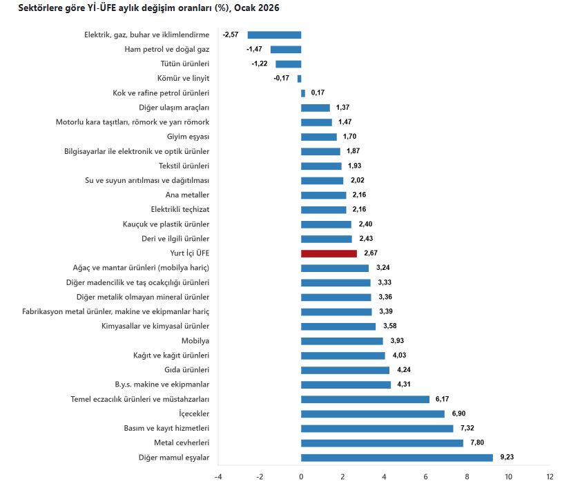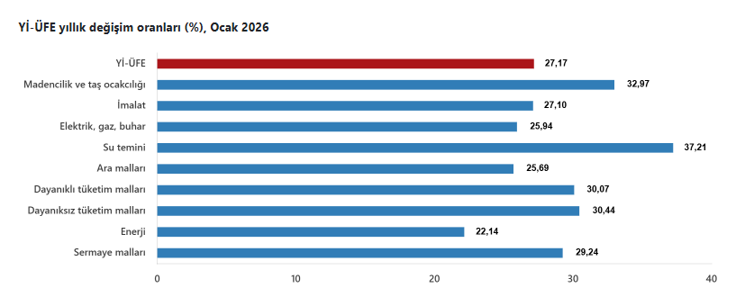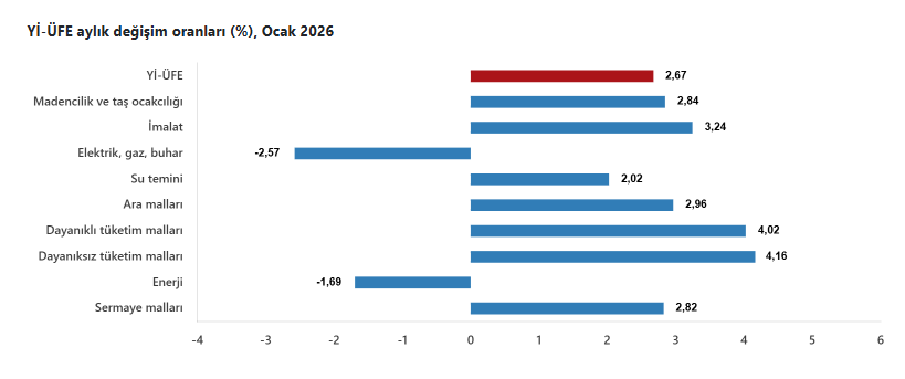 Yİ-ÜFE (2003=100) 2026 yılı Ocak ayında bir önceki aya göre %2,67 artış, bir önceki yılın Aralık ayına göre %2,67 artış, bir önceki yılın aynı ayına göre %27,17 artış ve on iki aylık ortalamalara göre %25,39 artış gösterdi.
