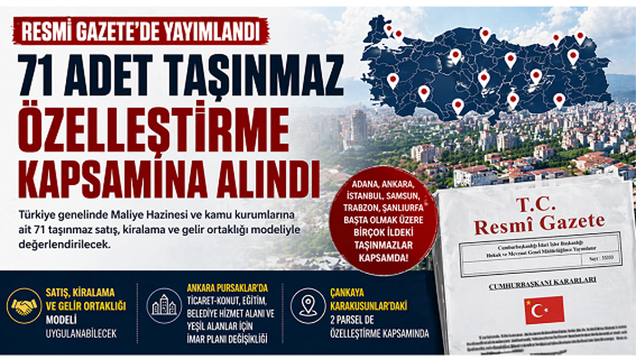 24 Nisan 2026 tarihli Resmi Gazete’de yayımlanan Cumhurbaşkanı kararlarıyla, Türkiye genelinde çok sayıda kamu taşınmazı özelleştirme kapsam ve programına alındı. Maliye Hazinesi ve çeşitli kamu kurumlarına ait toplam 71 taşınmazın ekonomiye kazandırılması hedefleniyor.