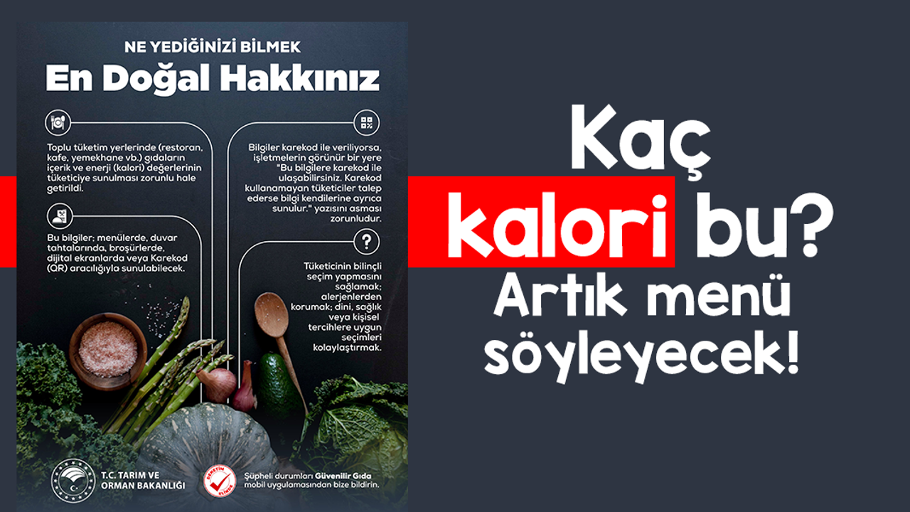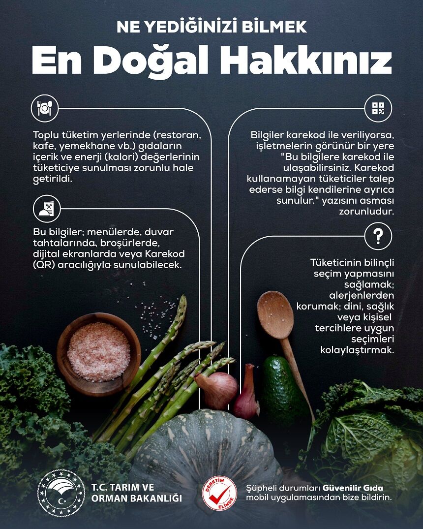 Tarım ve Orman Bakanlığı, toplu tüketim alanlarında gıda güvenliğini artırmaya yönelik önemli bir düzenlemeyi hayata geçirdi. Yeni uygulamayla birlikte restoran, kafe ve kantin gibi işletmelerde sunulan ürünlerin içerik, alerjen ve enerji (kalori) değerlerinin tüketiciye açık şekilde sunulması zorunlu hale getirildi.