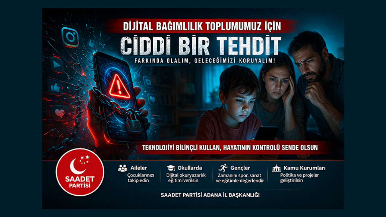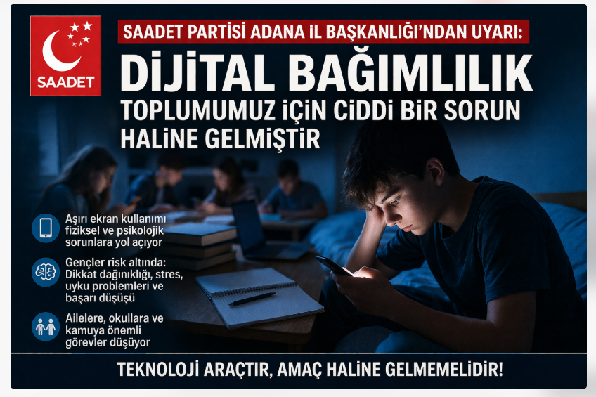 Saadet Partisi Adana İl Başkanlığı, dijital bağımlılığın toplumda giderek büyüyen bir sorun haline geldiğine dikkat çekerek, bilinçli teknoloji kullanımı çağrısında bulundu.