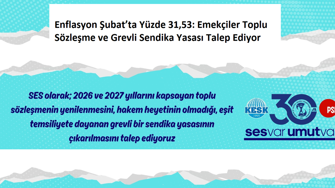 Sağlık ve Sosyal Hizmet Emekçileri Sendikası Genel Merkezi, şubat ayında aylık enflasyonun yüzde 2,96, yıllık enflasyonun ise yüzde 31,53 olarak gerçekleştiğini açıkladı. Sendika, 2026–2027 toplu sözleşmesinin yenilenmesini ve grev hakkını içeren eşit temsiliyetli bir sendika yasasının çıkarılmasını talep etti.