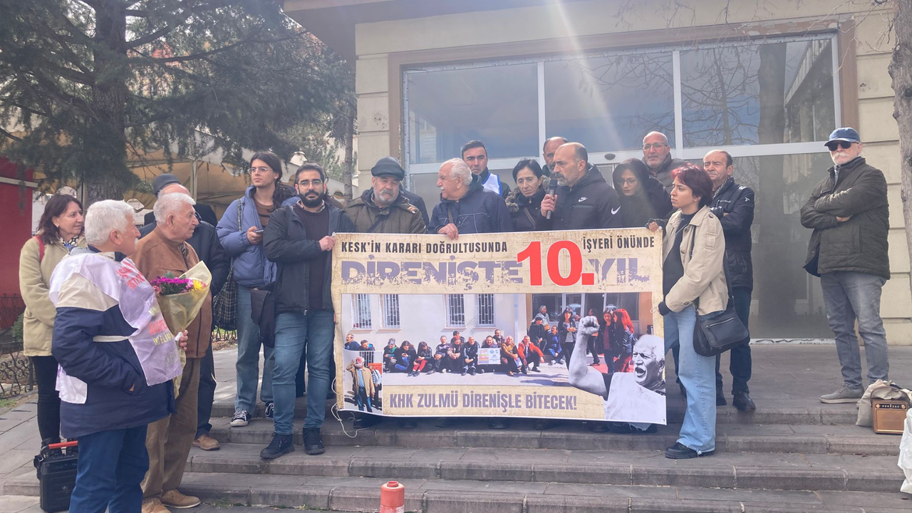 KHK ile kamu görevinden ihraç edilen SES Ankara Şube üyesi Mahmut Konuk’un işyeri önünde başlattığı direnişin 10. yıldönümünde eylem düzenlendi. Eyleme SES ve KESK yöneticileri katılırken, KHK sürecinin yarattığı hak kayıpları ve ihraçların yol açtığı toplumsal tahribat bir kez daha gündeme taşındı.