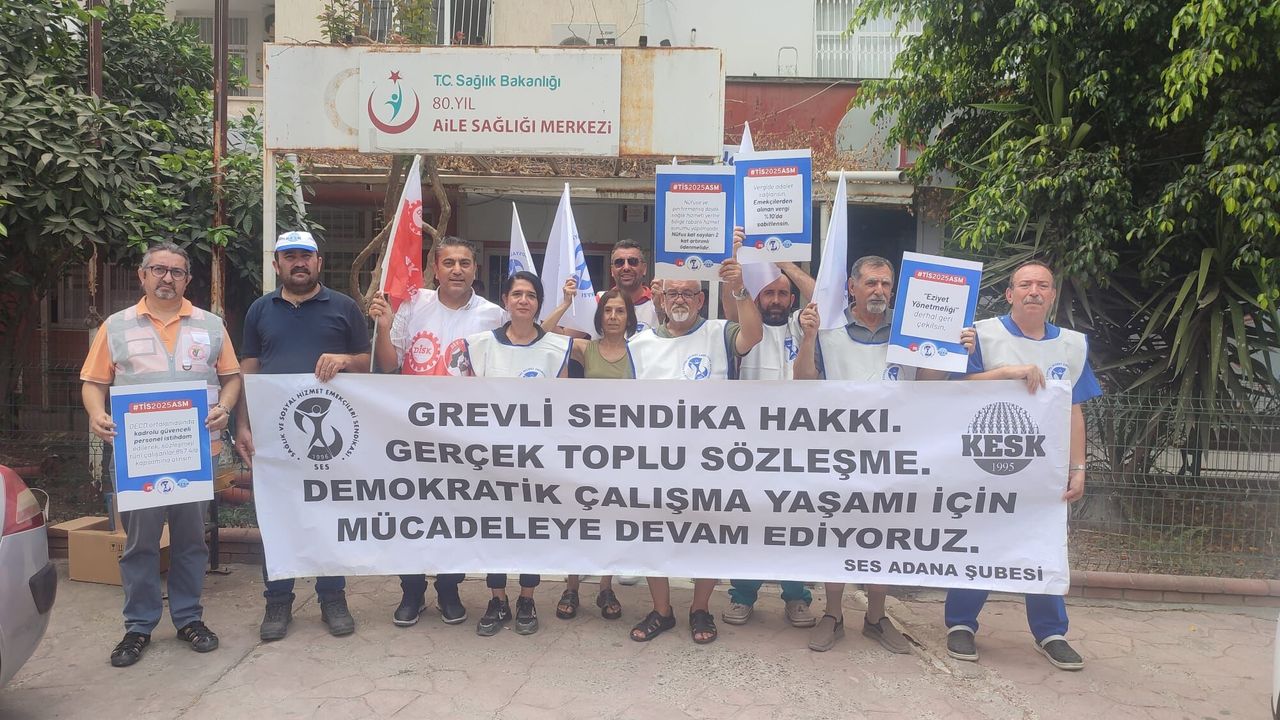 Sağlık ve Sosyal Hizmet Emekçileri Sendikası (SES) Adana Şube Yönetim Kurulu, 2026-2027 yıllarını kapsayan TİS’te yer alan nöbet ücretlerinin artırımlı ödenmesine ilişkin hükmün Sağlık Bakanlığı’nın görüş yazısıyla daraltıldığını belirterek yetkili sendikaya çağrıda bulundu: “Madem bir TİS imzaladınız, anlaşmanızın arkasında durun ve uygulatın.”