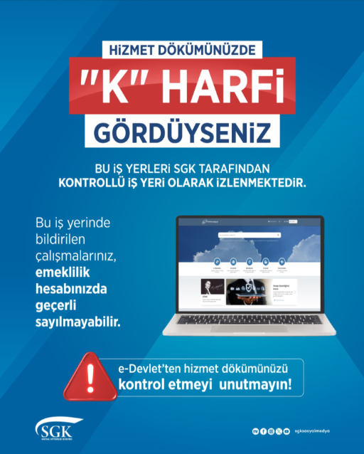 Duyuruda, 'Dikkat! Hizmet dökümünüzde 'K' harfi gördüyseniz, bu iş yerleri SGK tarafından kontrollü iş yeri olarak izlenmektedir. Bu iş yerinde bildirilen çalışmalarınız, emeklilik hesabınızda geçerli sayılmayabilir' denildi.
