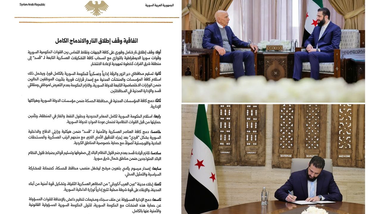 Suriye hükümeti ile Suriye Demokratik Güçleri (SDG) arasında varılan kapsamlı ateşkes anlaşmasıyla Deyrizor ve Rakka’nın idari ve askeri kontrolü Şam’a devrediliyor. SDG güçlerinin Savunma ve İçişleri Bakanlıklarına entegrasyonu, petrol ve gaz sahalarının merkezi yönetime geçmesi, IŞİD tutukluları ve kamplarının devlet kontrolüne alınması kararlaştırıldı.