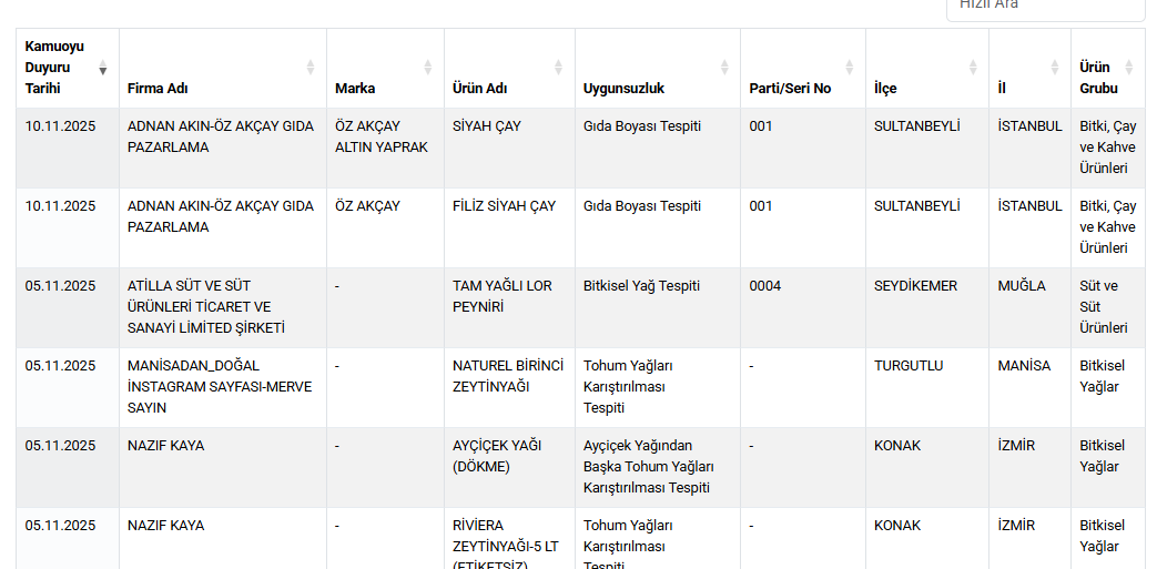 Bakanlık, vatandaşları güncel listeyi kontrol etmeleri ve şüpheli ürünleri tüketmemeleri konusunda uyarıyor.