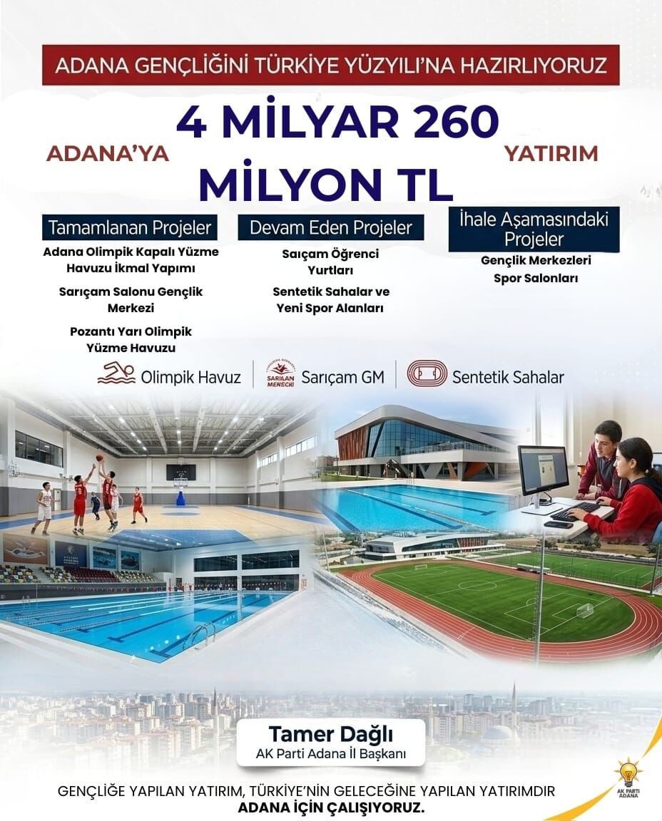 Tamamlanan projeler arasında Adana Olimpik Kapalı Yüzme Havuzu ikmal yapımı, Sarıçam Salonlu Gençlik Merkezi ve Pozantı Yarı Olimpik Yüzme Havuzu gibi tesisler bulunuyor. Devam eden projelerle Sarıçam’daki öğrenci yurtları, ilçelerdeki sentetik saha dönüşümleri ve yeni spor alanlarıyla Adana’nın spor altyapısı daha da güçlenecek.