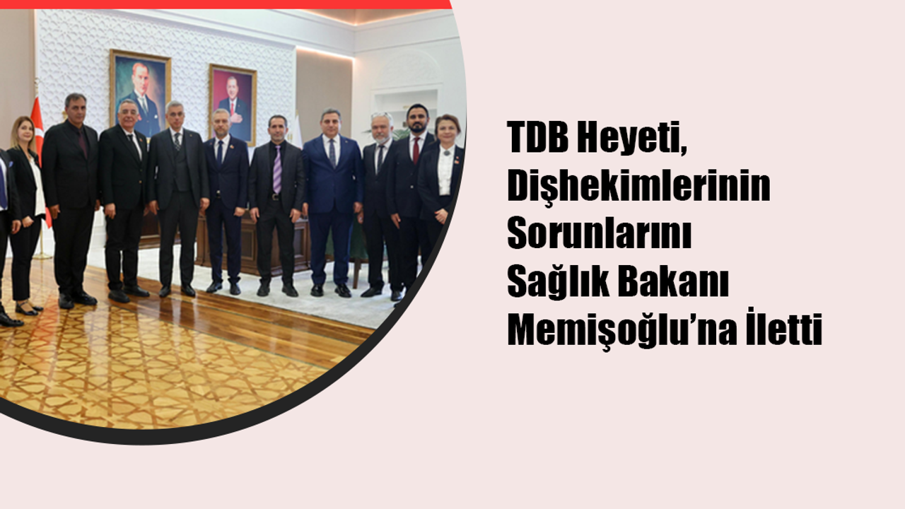 TDB Genel Başkanı Fatih Güler, Genel Başkanvekili Tolga Beray, Genel Saymanı Alper Dilek, Genel Sekreteri Gassan Yücel, Merkez Yönetim Kurulu Üyeleri Gürbüz Eldeniz, Fatih Uçar, Esra Yamak ve Meltem Çağın Alkan Yıldırım ile TDB Akademi Başkanı Prof. Dr. Hare Gürsoy, Genel Sekreteri Prof. Dr. Ezher Hamza Dayısoylu, Yürütme Kurulu Üyesi ve Erzurum Dişhekimleri Odası Başkanı Prof. Dr. Cenk Fatih Çanakçı, Isparta Dişhekimleri Odası Başkanı Aşkın Daldal ve TDB Öğrenci Kolu Başkanı Sıla Beşlioğlu’nun yer aldığı heyet, meslek sorunlarını içeren kapsamlı bir dosyayı Bakan’a sundu.