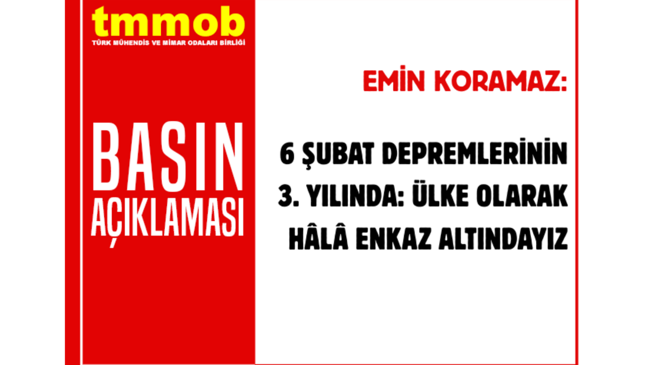 TMMOB Yönetim Kurulu Başkanı Emin Koramaz, 6 Şubat 2023’te Kahramanmaraş merkezli meydana gelen ve 11 ili etkileyen depremlerin üçüncü yılı dolayısıyla 5 Şubat 2026 tarihinde yazılı bir basın açıklaması yaptı. Koramaz, üç yıl geçmesine rağmen acının dinmediğini, yıkımın sonuçlarının ise daha da ağırlaştığını vurguladı.