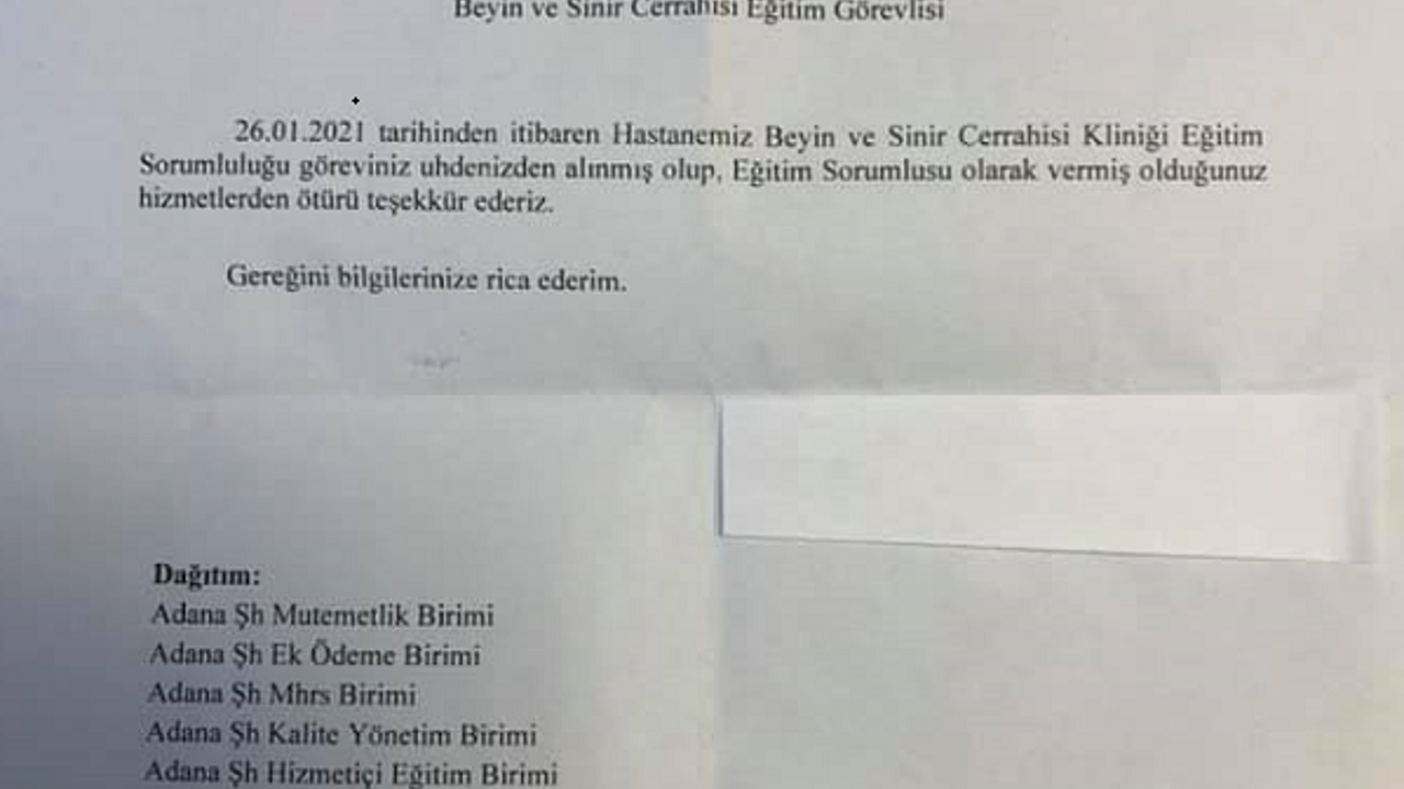 "Adana Şehir Eğitim ve Araştırma Hastanesindeki Beyin Cerrahi Kliniği eğitim sorumluluğu görevimden herhangi bir gerekçe gösterilmeden alındım. Oysaki biz o kliniği başta Doç. Dr. Yurdal Gezercan arkadaşımla ve diğer arkadaşlarımızda desteğiyle bölgemizin ve Türkiye’deki eğitim ve araştırma hastaneleri arasında en fazla hasta bakılan ve en fazla ameliyat yapılan klinik yapmıştık. Eğitim Sorumluluğunu 3-5 ay önce kliniğimize dışarıdan gelen bir meslektaşımızı verdiler. Bunca yıl verilen emeğin karşılığı bu olmamalıydı. Oysa ki Kliniğimiz içinden birine verilecek bu sorumluluk beni çok mutlu edecekti. Çünkü yılların emeği bunu gerektirirdi. Burada sorun kişisel değil sistemseldir. Çünkü siyaset gerçeğin ve her şeyin önüne geçmiştir. Her şeye rağmen daha bilimsel, daha demokratik, daha nitelikli hekimlik için mücadeleye devam" dedi.