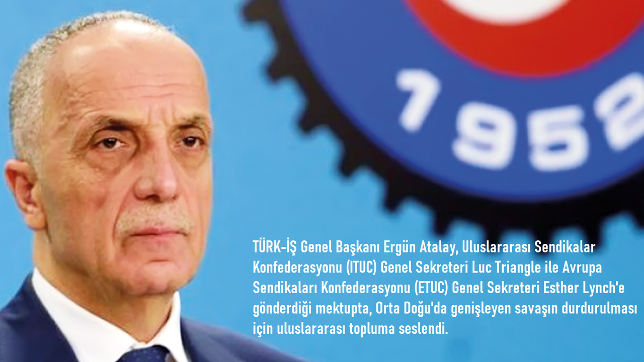 TÜRK-İŞ Genel Başkanı Ergün Atalay, Uluslararası Sendikalar Konfederasyonu (ITUC) Genel Sekreteri Luc Triangle ile Avrupa Sendikaları Konfederasyonu (ETUC) Genel Sekreteri Esther Lynch'e gönderdiği mektupta, Orta Doğu'da genişleyen savaşın durdurulması için uluslararası topluma seslendi.