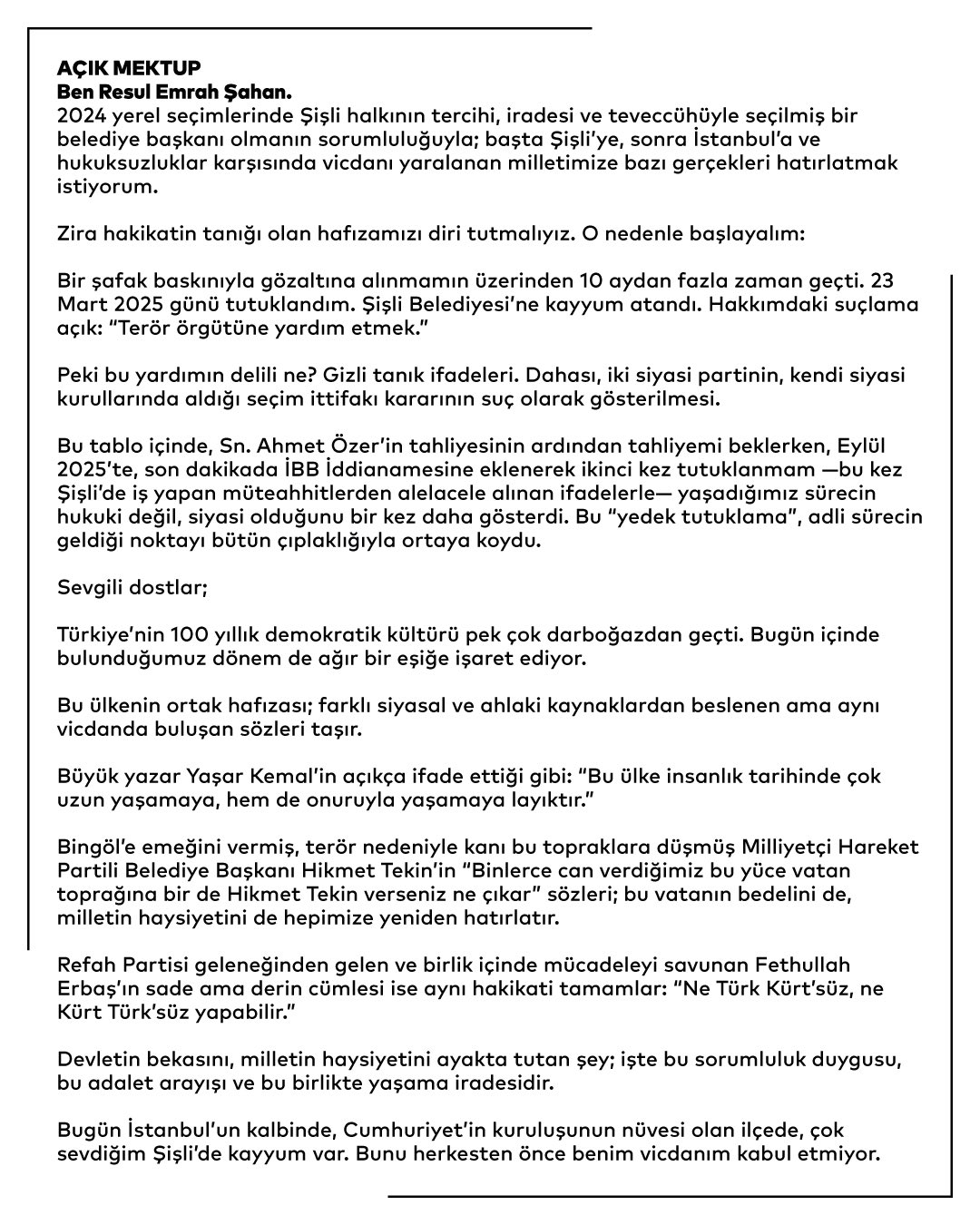 Tutuklu bulunan Şişli Belediye Başkanı Resul Emrah Şahan, Silivri Cezaevi’nden kaleme aldığı açık mektupta, tutukluluk sürecine, hakkındaki suçlamalara ve Türkiye’de hukuk ile demokrasiye dair değerlendirmelerde bulundu. Şahan, 23 Mart 2025’te tutuklandığını hatırlatarak, Şişli Belediyesi’ne kayyum atanmasına tepki gösterdi.