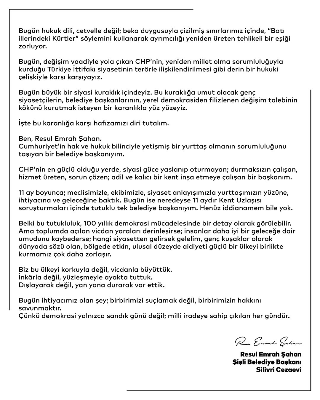 Resul Emrah Şahan, mektubunun sonunda Cumhuriyet’in hak ve hukuk bilinciyle yetişmiş bir yurttaş ve belediye başkanı olarak sorumluluk taşımaya devam edeceğini belirtti.