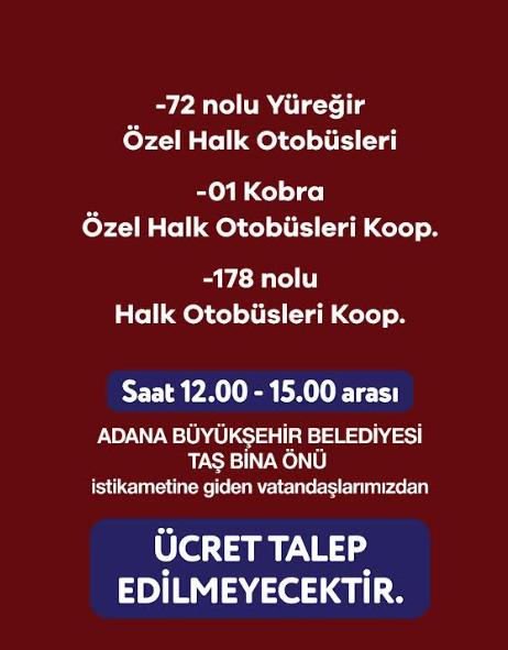 Açıklanan saatler arasında Adana Büyükşehir Belediyesi Taş Bina önü istikametine giden vatandaşlardan ücret talep edilmeyecek.