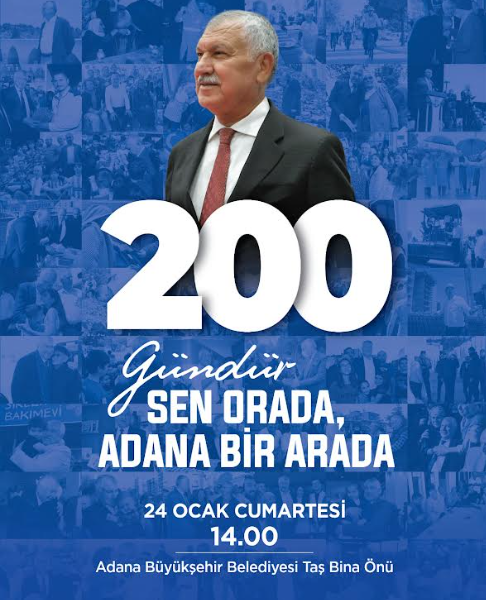 Yarın (24 Ocak Cumartesi) saat 14’te, Adana Büyükşehir Belediye Başkanı Zeydan Karalar’ın gözaltına alınıp tutuklanmasının 200. günü nedeniyle, Adana Büyükşehir Belediyesi Taş Bina önünde geniş katılımlı destek buluşması düzenleniyor.
